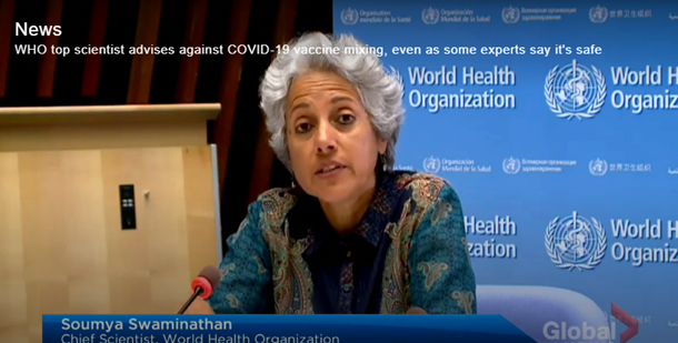 本周一(2021年7月12日)世界卫生组织首席科学家,Soumya Swaminathan (斯瓦米纳坦)在一次在线简报中提到:“如果在一些国家民众自己决定何时及谁接种第二剂,第三剂,甚至第四剂疫苗, 这将会出现混乱”. "It will be a chaotic situation in countries if citizens start deciding when and who will be taking a second, a third and a fourth dose."