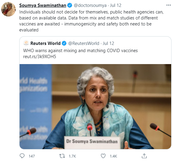 "There are people who are thinking about mixing and matching. We receive a lot of queries from people who say they have taken one [dose] and are planning to take another one (doses). It’s a little bit of a dangerous trend here. We are in a data-free, evidence-free zone as far as mix and match. There is limited data on mix and match,”