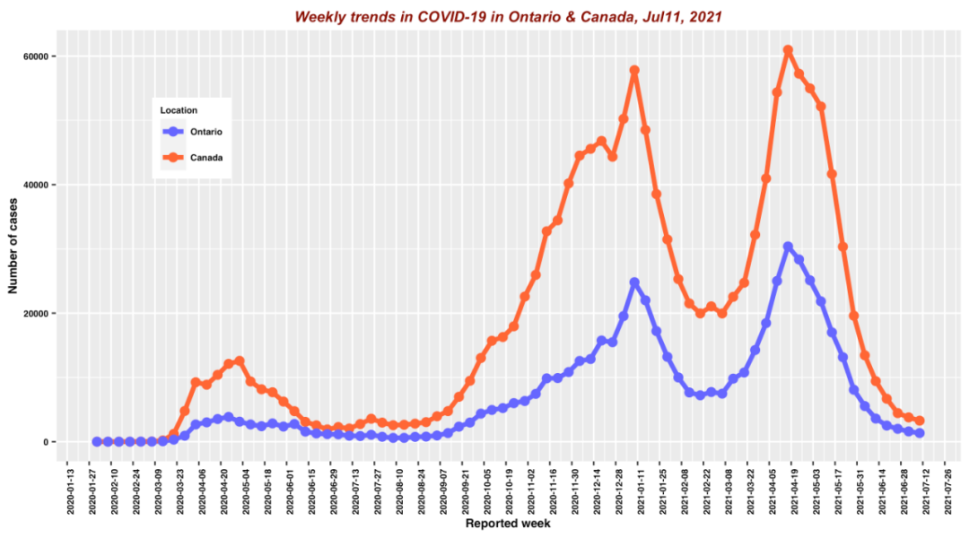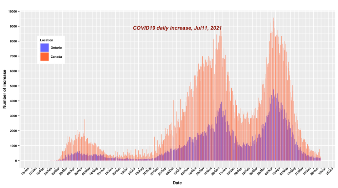 目前加拿大的疫情持续稳定下降,截止到2021年7月11日,安省过去7天平均每日新增新冠感染病例已低于2百例,全国7日平均新增低于5百例。这一水平约与10个月前第2波疫情开始前的状况相当。自2021年4月中旬每日新增病例开始下降,至本周已连续12周新增病例稳定下降。特别是自6月30日安省第2阶段重启以来,虽然人们的社交活动增加了,但新增病例仍在连续下降,并没有反弹。结合目前疫苗接种进展顺利,因此,有专家认为,加拿大的新冠大流行很可能在8月下旬左右结束。那么加拿大的新冠大流行会于近期结束吗?何时能够结束?我们结合目前的流行状况,疫苗的接种进展和最新的相关研究结果对这些焦点问题做些分享。