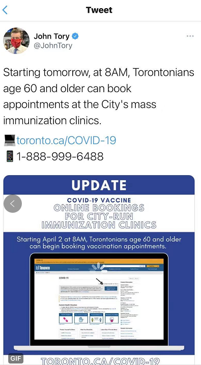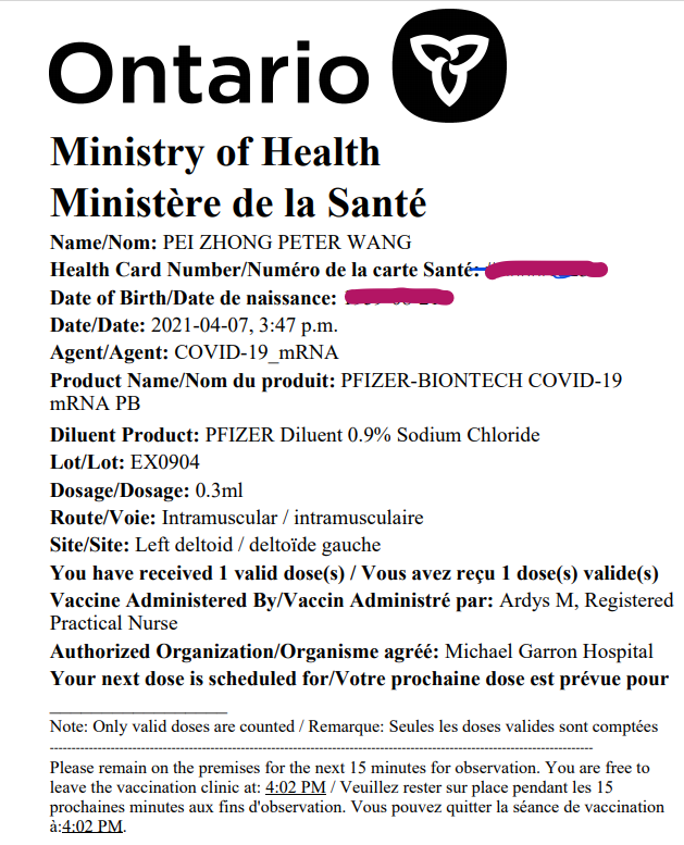1. 网上登记预约: 对我这个年龄组(60岁以上)最先开放的是到药店接种阿斯利康疫苗,因为当时没有其它选择,所以我得到消息便预约了。但在等候期间,通过多伦多市长John Tory的推特得知,多伦多地区开放了60岁以上年龄组接种其它疫苗,于是我又第一时间预约了附近医院。预约需要提供一些个人信息,包括健康卡号但,没有接种何种疫苗的选项。