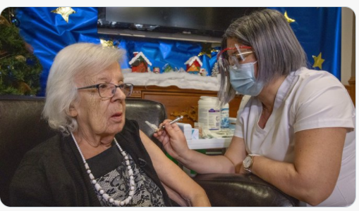 安大略是加拿大最大的省,人口近1500万,占全国总人口的39%。因此,安省疫情及疫苗接种情况对全国影响极大。加拿大第一批疫苗接种于2020年12月14日在安大略和魁北克开始的。下图,89岁老人接种第一针辉瑞新冠疫苗也标志着加拿大新冠疫苗人群接种正式启动。