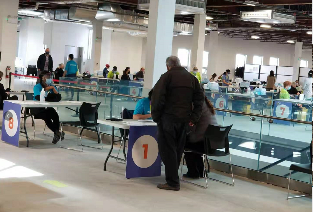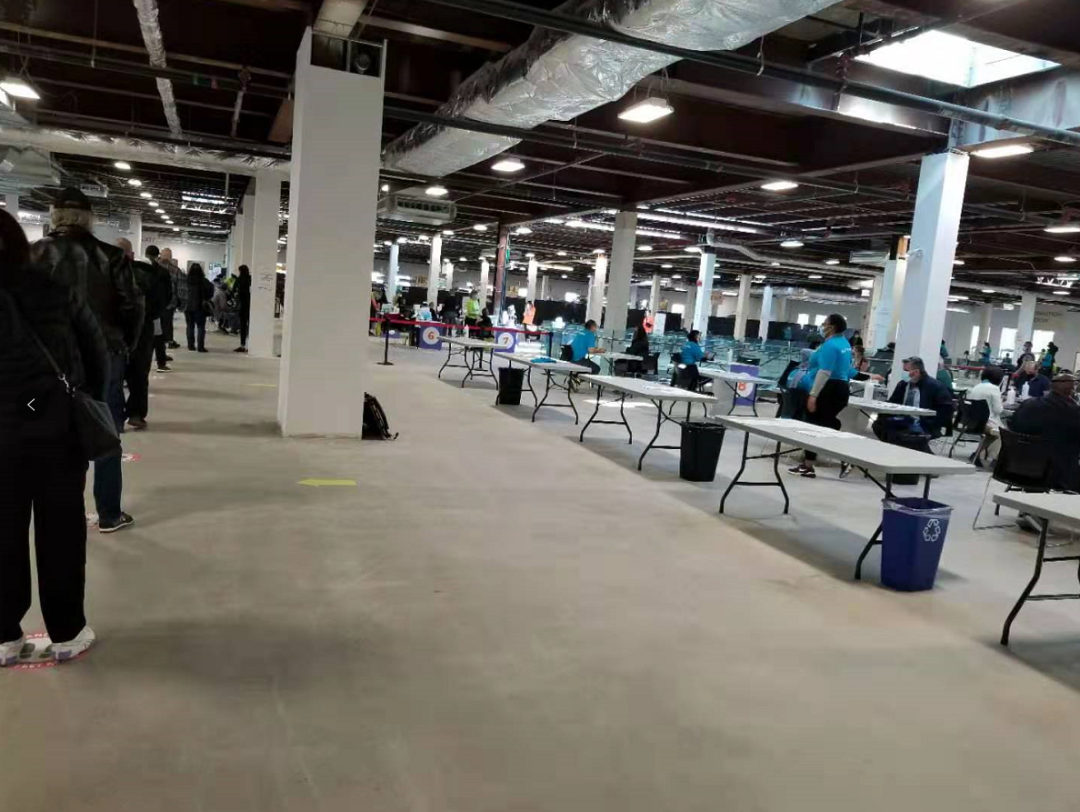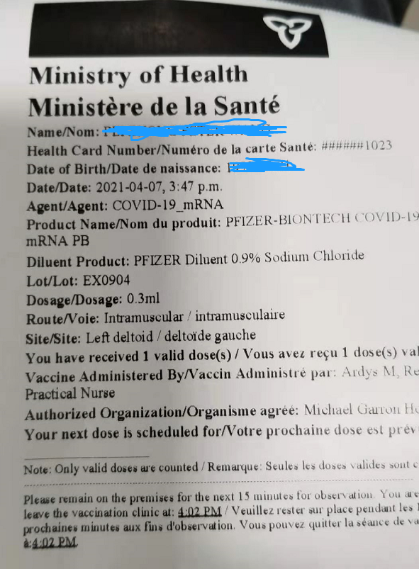 2) 在保持两米社交距离的情况下,排队登记核实。我基本按预约时间到达,仅排队等待了几分钟。登记员询问多项基本情况,同时需要出示医疗健康卡,提供电话号码等。之后,登记员告诉我今天接种的是辉瑞疫苗,此时才能真正知道自己将接种何种疫苗。不过,因为阿斯利康疫苗便于保存,所以其接种场所主要在药店及家庭医生诊所;而我们今天去的接种点是多伦多地区的一个大医院,所以预计应该是接种辉瑞或莫德那疫苗,而现实也证明了我们的猜测。