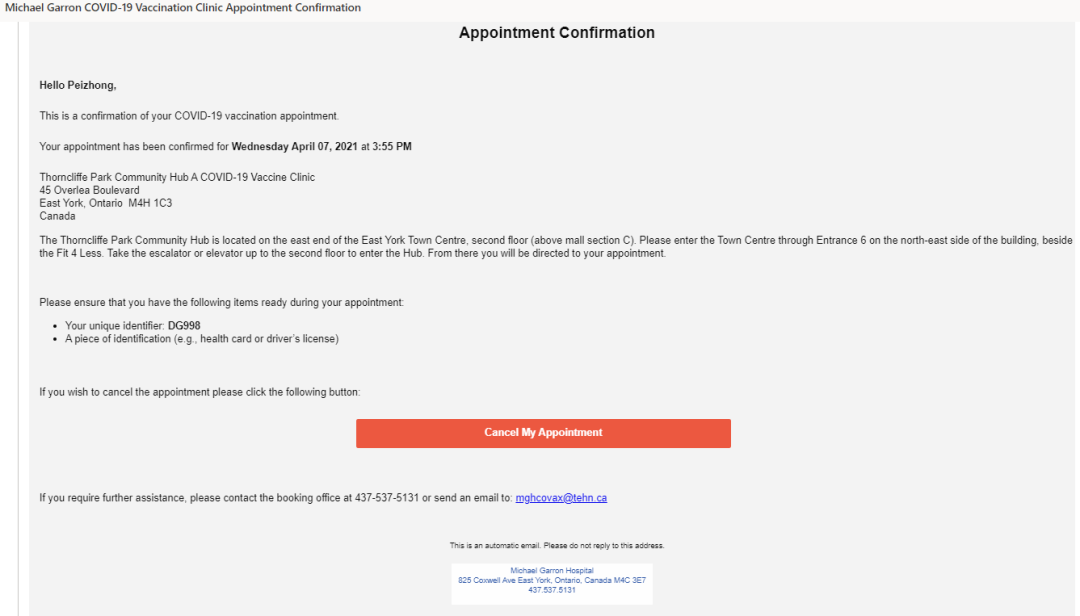 可能当时知道的人还不是很多,我预约时,时间地点的选择还比较多,我选择了于4月7号在离家很近的Michael Garron医院接种,随之收到了邮件确认通知: