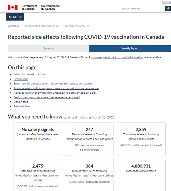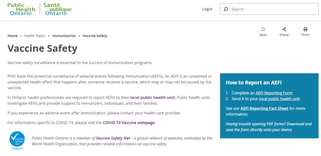 下图是安大略省疫苗安全监测信息截屏:(https://www.publichealthontario.ca/en/health-topics/immunization/vaccine-safety)