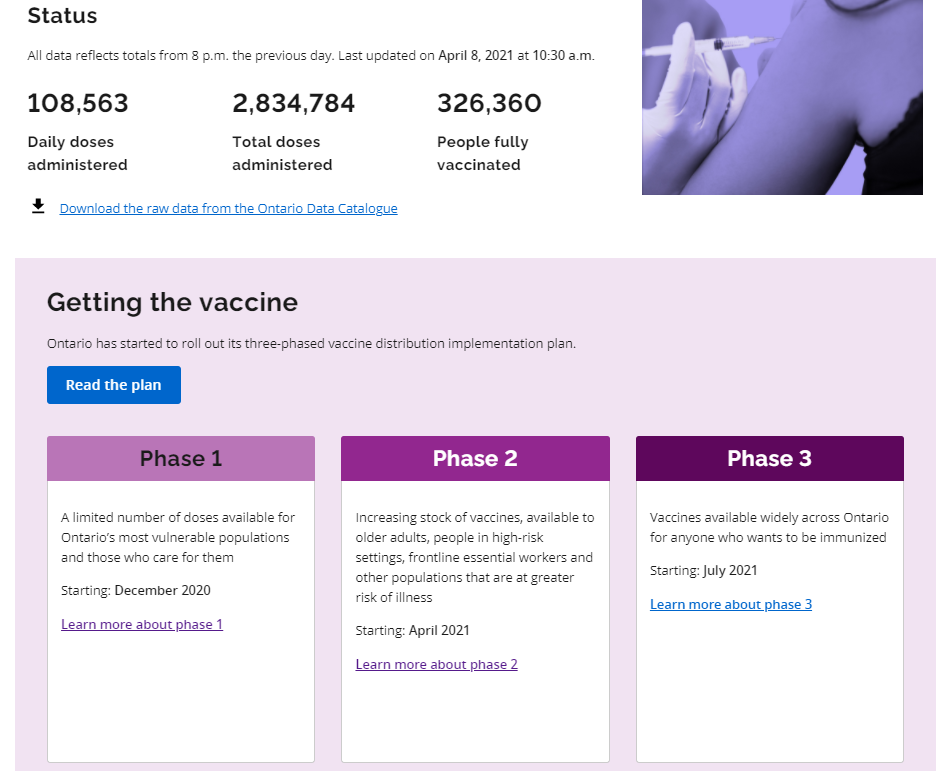 加拿大新冠疫苗完全依赖于进口,联邦政府负责采购及按各省的人口比例分配。各省根据自己的情况制定接种方案并完成接种。由于中间出现了几次新冠疫苗供应不足问题,整体接种进展相对缓慢。近四个月过去了,目前(2021-04-07)加拿大及安大略省疫苗接种率(以至少接种一次计算)均为16.4% , 远远落后于英国(48%)和美国(33%)。就安大略省而言,按优先接种顺序可分为三个阶段:第一阶段为2020年12月至2021年3月,第二阶段为2021年4月1日至6月,第三阶段是2021年7月以后。(具体操作方案一直在不断调整)。从下图可以看出,截至2021年4月8日,安大略省每天接种疫苗超过10万只,全省已完成接种280万只,接种人数(至少一次接种)已超过32万。
