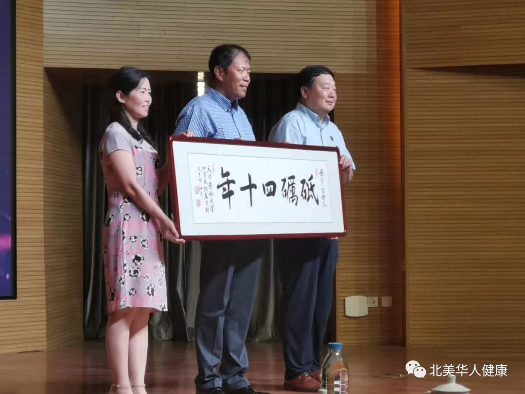 发言后,王培忠代表天津医科大学加拿大校友会把“砥砺四十年”的一件艺术品赠送给学院。左起:张秀敏书记、王培忠教授、汤乃军院长